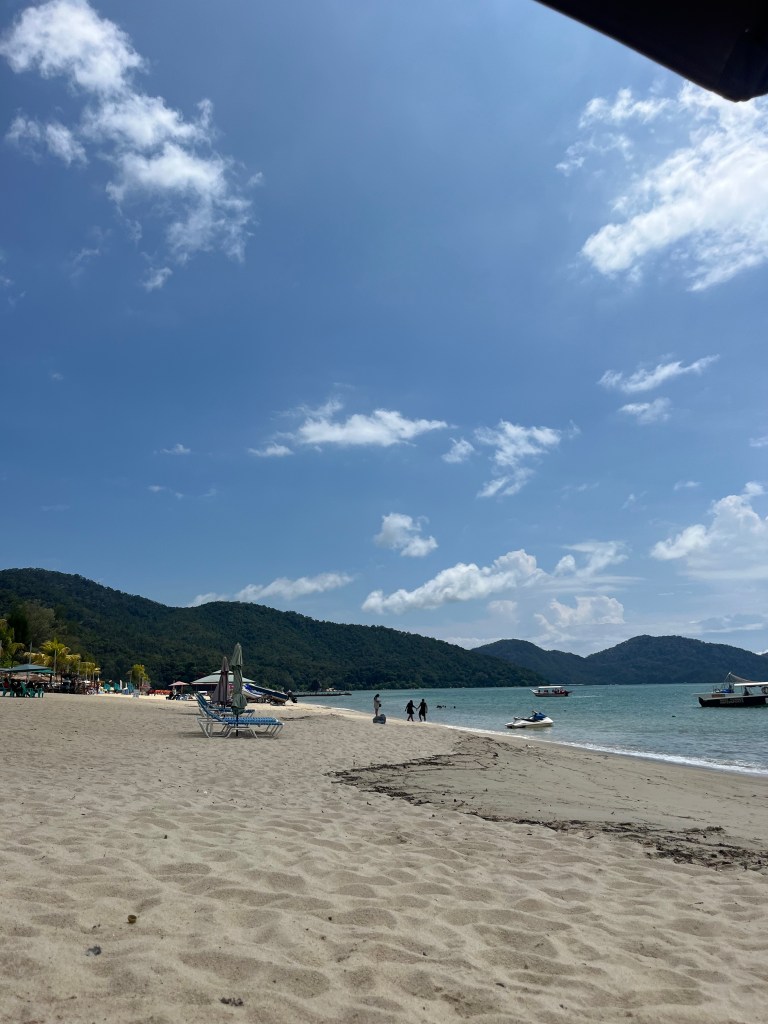The day before, we’d chatted with a friendly local who recommended Batu Ferringhi, about 30 minutes away, so we hopped on a slightly bumpy bus and headed for the coast. It was our first beach day of the holiday, and wow, absolutely stunning.