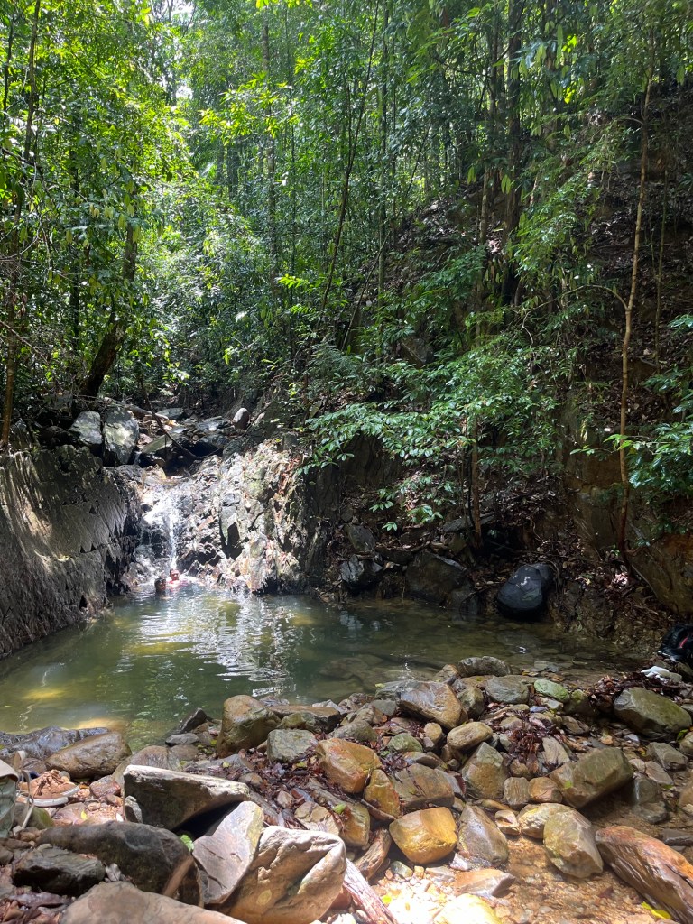 Once the storm passed, we were rewarded with stunning views across the island, with cable cars drifting across the skyline in the distance. From there, we continued deeper into the jungle toward the so-called Blue Pool (which, admittedly, wasn’t very blue). The walk was challenging but shaded and cool, and despite the freezing water, I couldn’t resist jumping in for a quick dip.